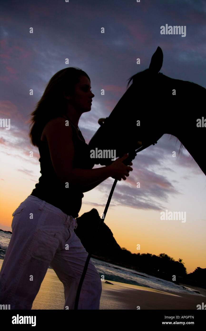 Frau Mit Pferd Bei Sonnenuntergang Silhouette Mit Bergen Im Hintergrund Stockfotografie Alamy