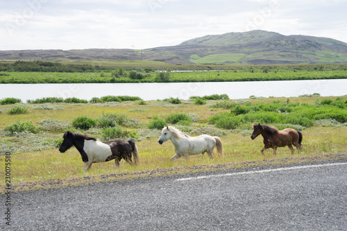 Islandische Pferde Die Hinunter Eine Strasse Landliche Landschaft Island Galoppieren Stockbild Bild Von Galoppieren Strasse 65663339